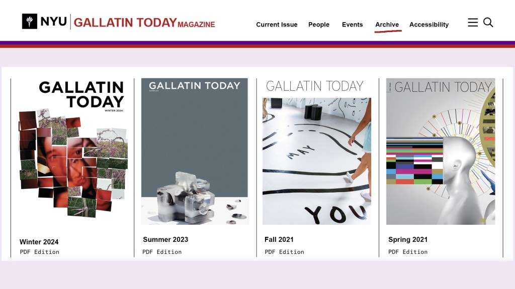 The aim for the architectural aesthetic of Gallatin Today is to keep the landing page and lower level pages clear, concise and accessible. At all times there will be a link to NYU Accessibility resources. Each page will be checked so that it meets Web Content Accessibility Guidelines (WCAG) as outlined by the NYU Digital Accessibility Checklist. All content will be categorized, meta tagged and stored using proper file naming conventions. This process will also be an integral part of SEO strategy for the new site. I also see this as one of the most important challenges in creating the new site.